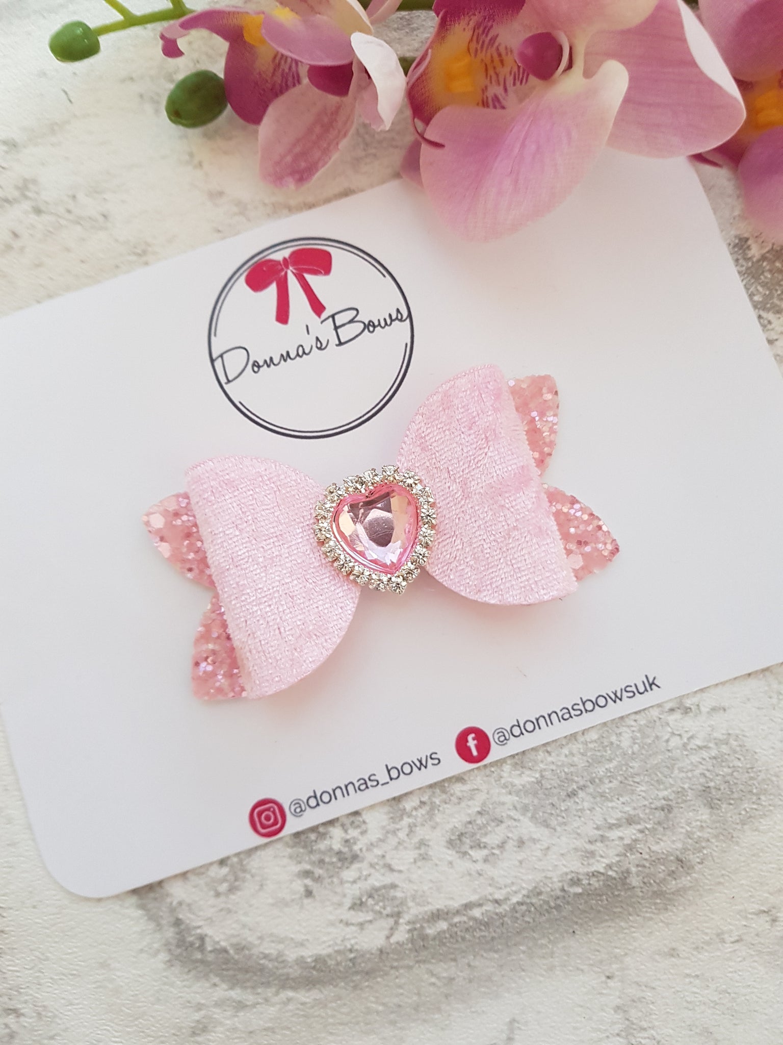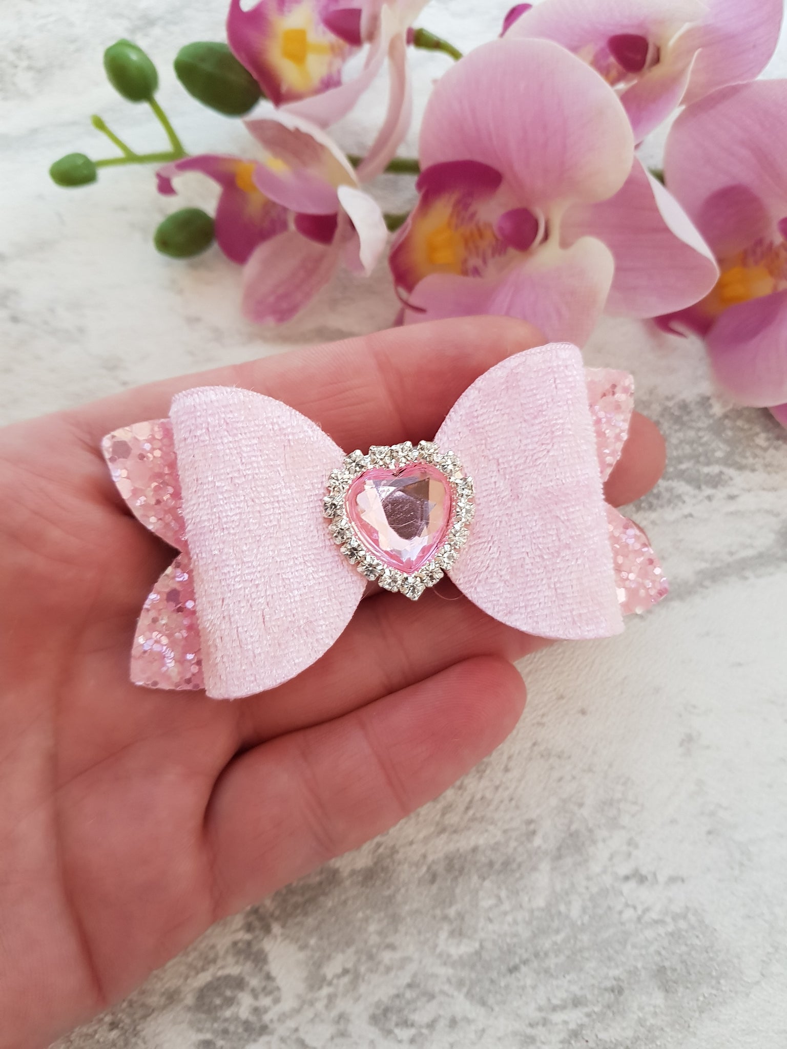 Pink glitter and velvet hairbow. Centre of the bow features a heart gem centre.