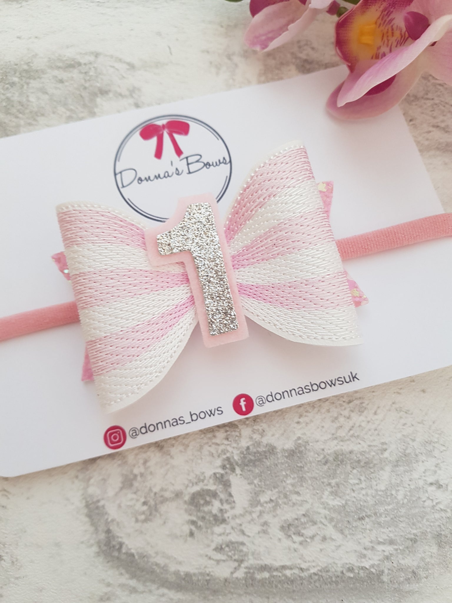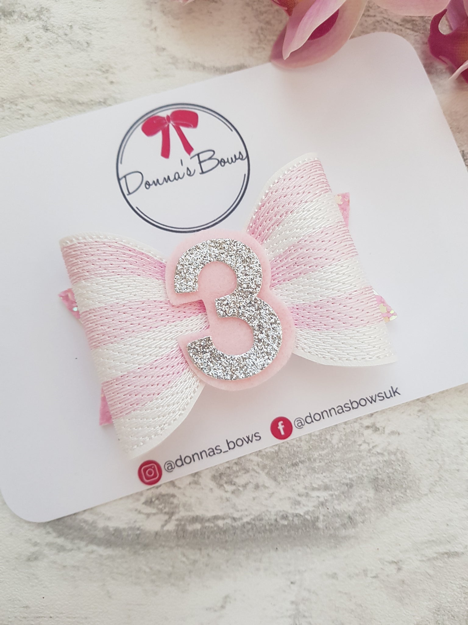 Beautiful birthday bow with age detail, pink glitter and embroidered stripe loops.