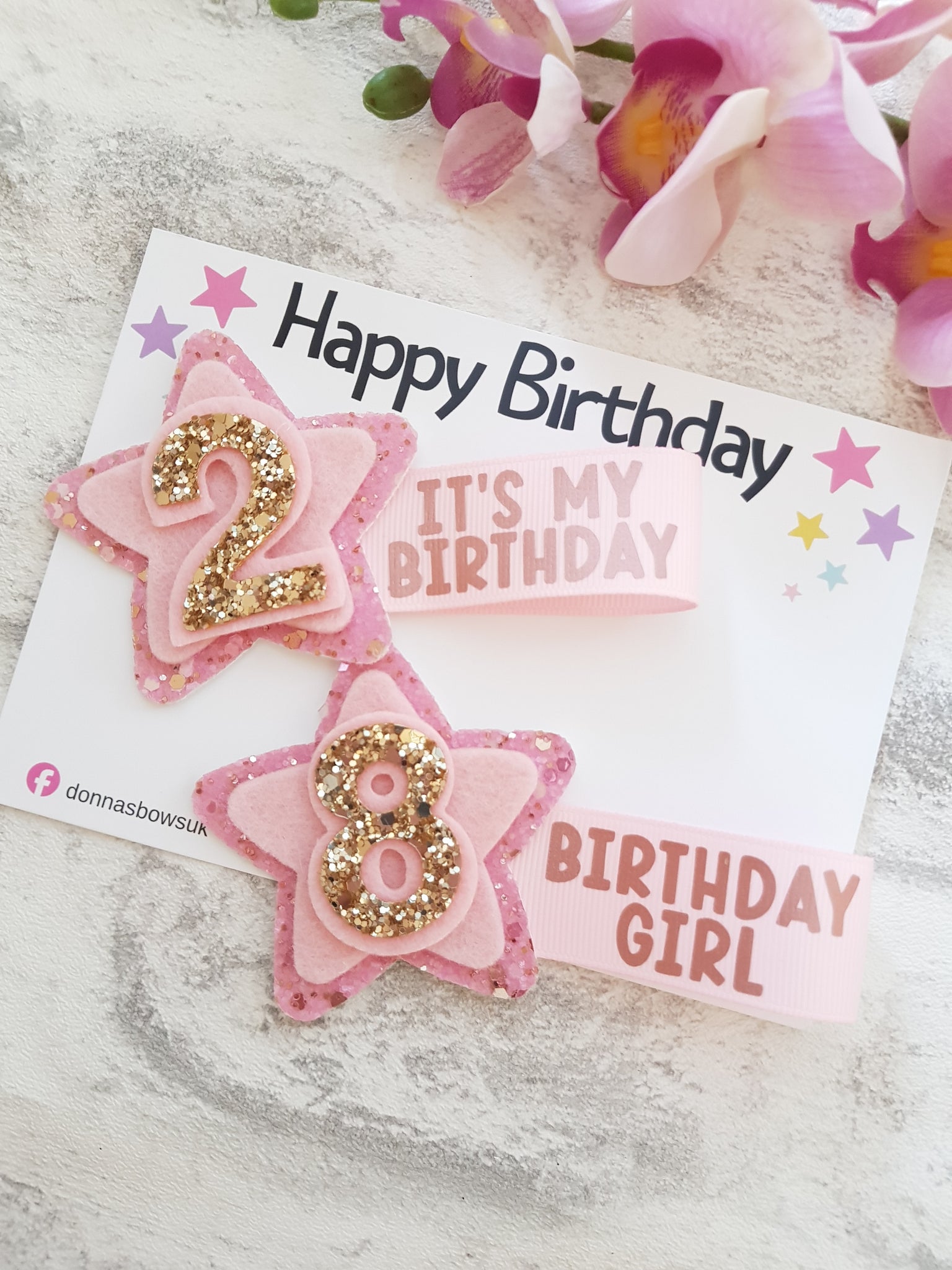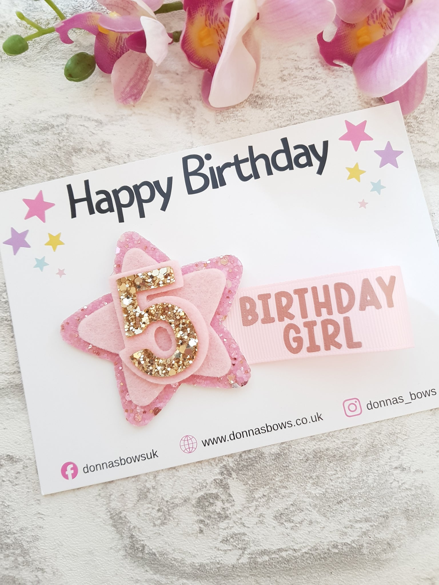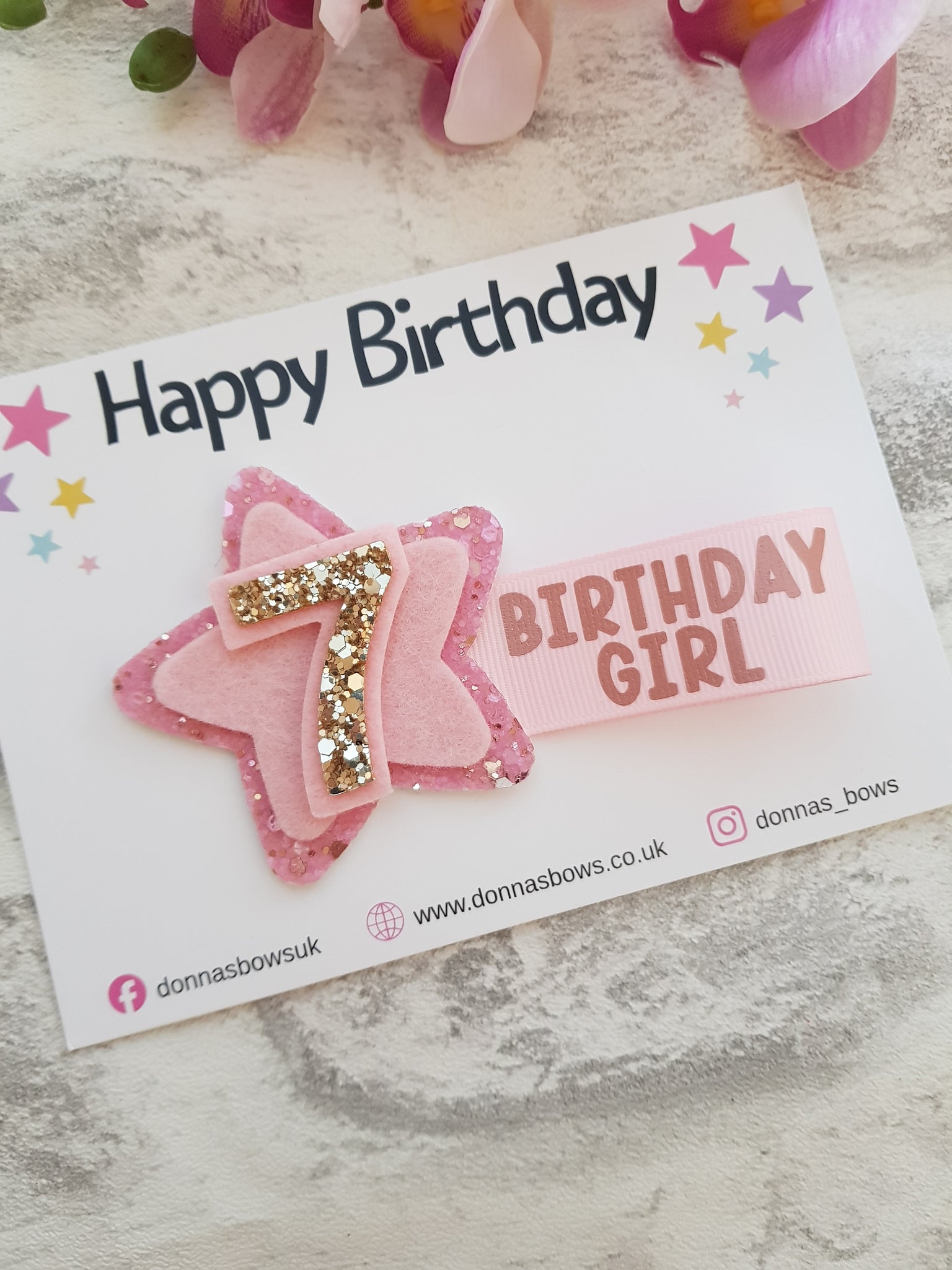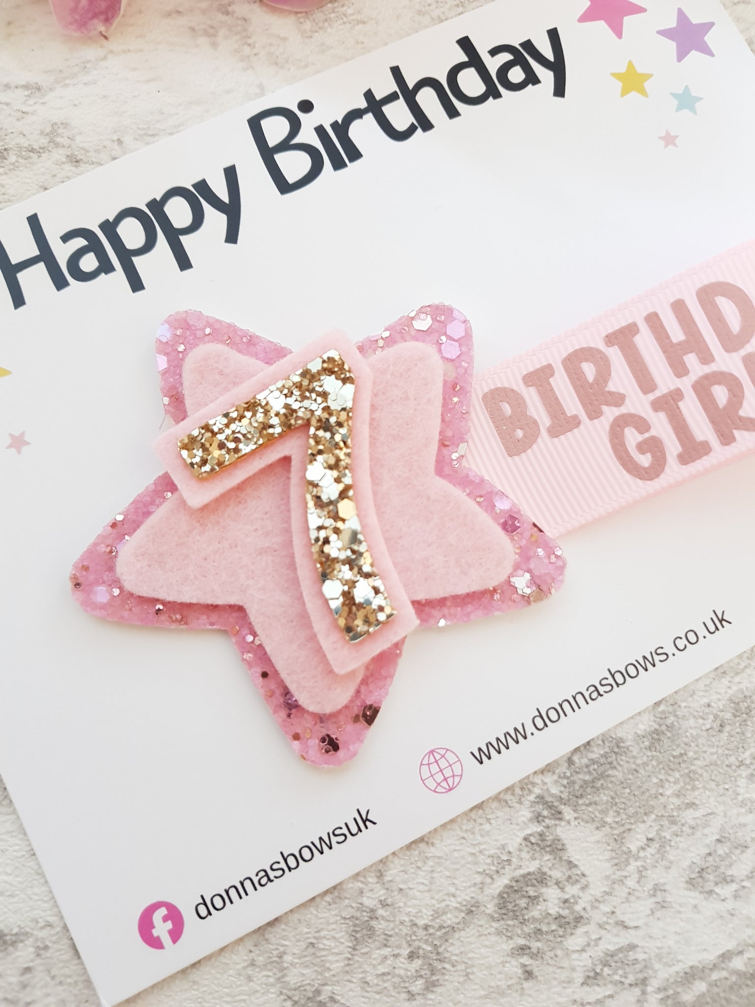 Featuring a pink and golds glittery star and ribbon tail message.