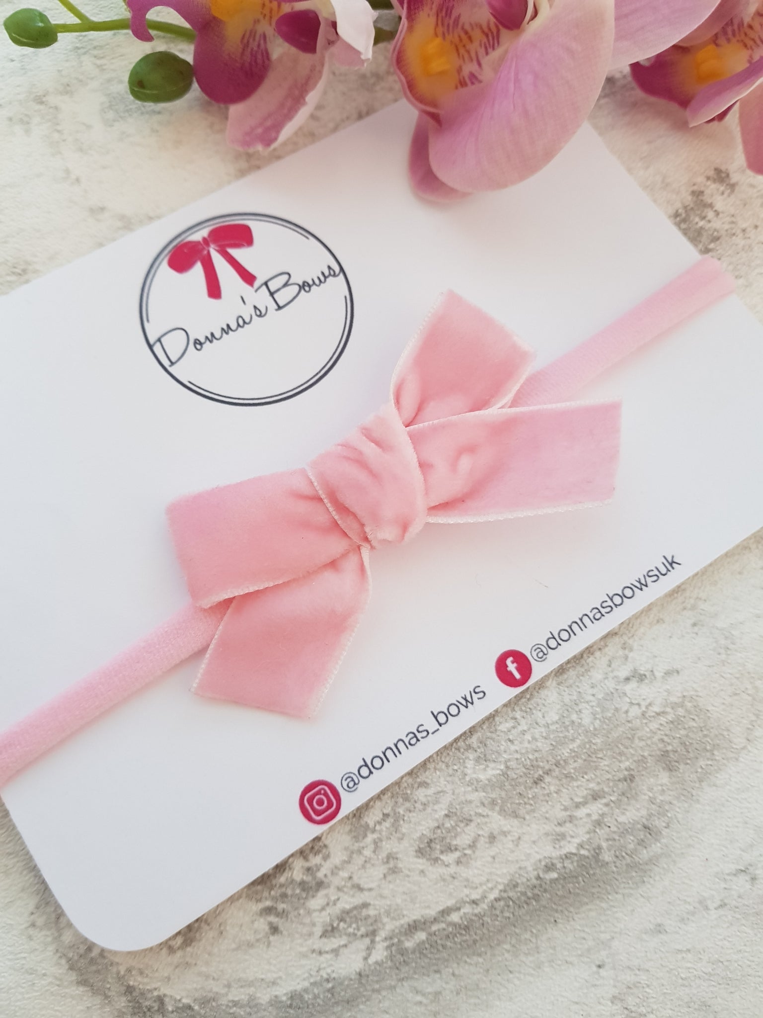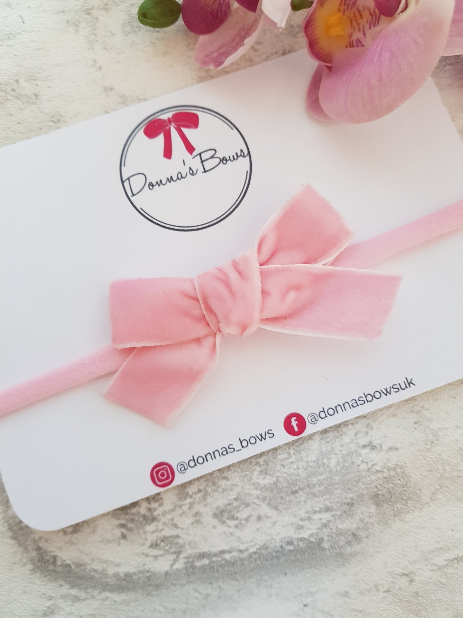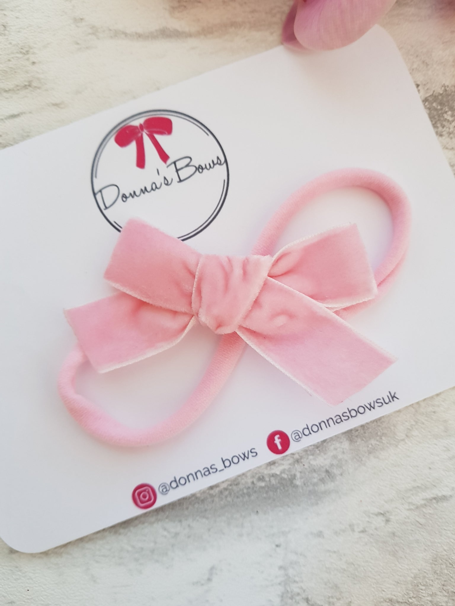 Adorable hand tied velvet ribbon bow on a super soft nylon head band.