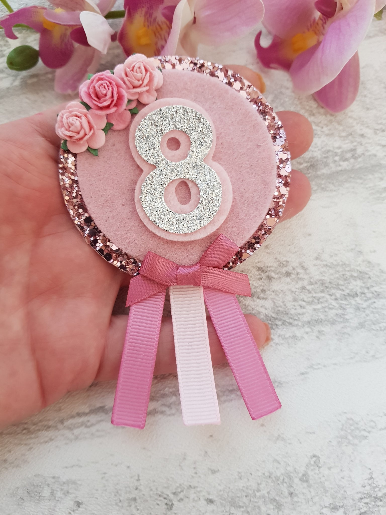 Pink glitters, rose flower embellishments and a satin bow make this the perfect accessory for the birthday girl.