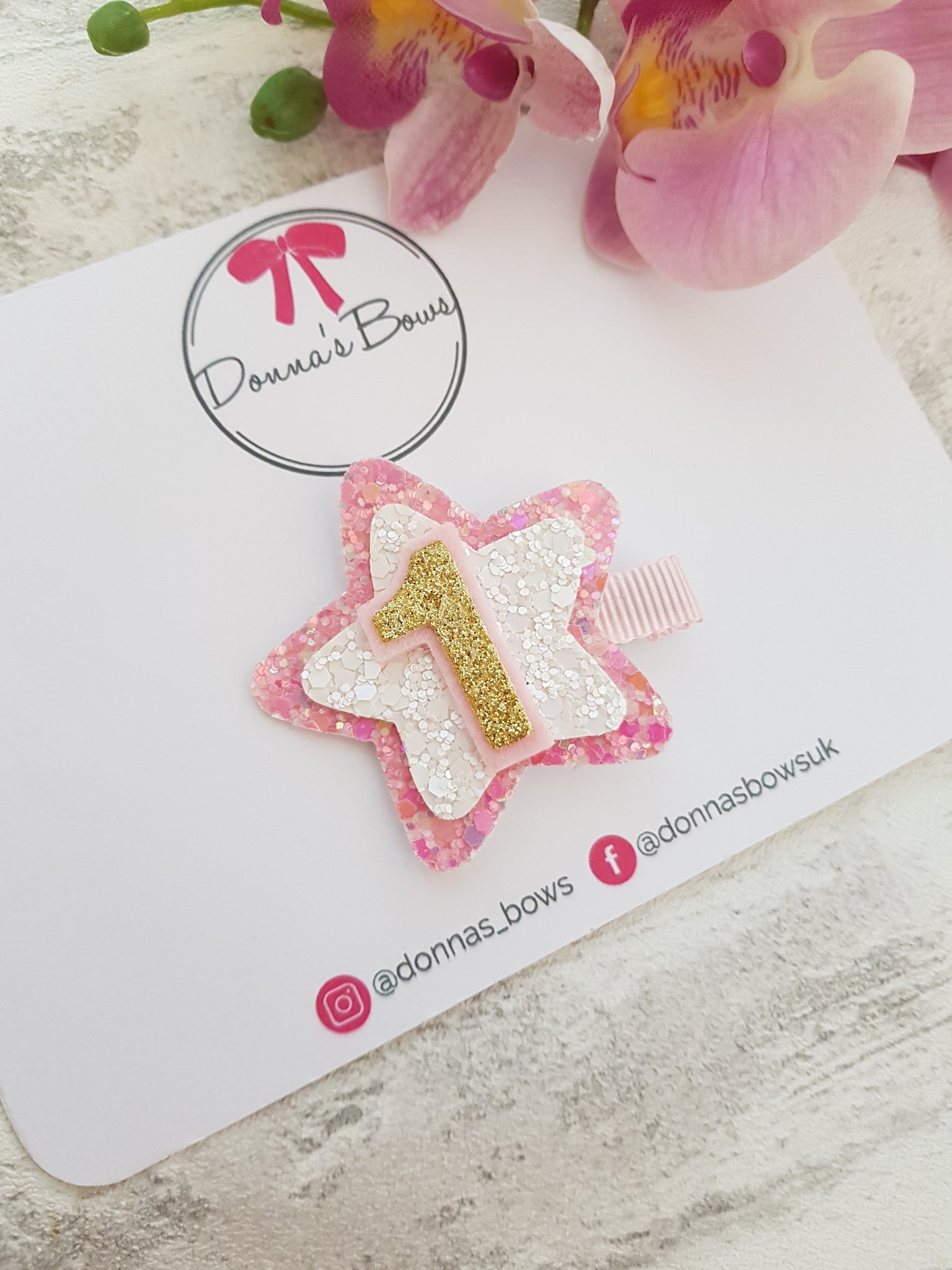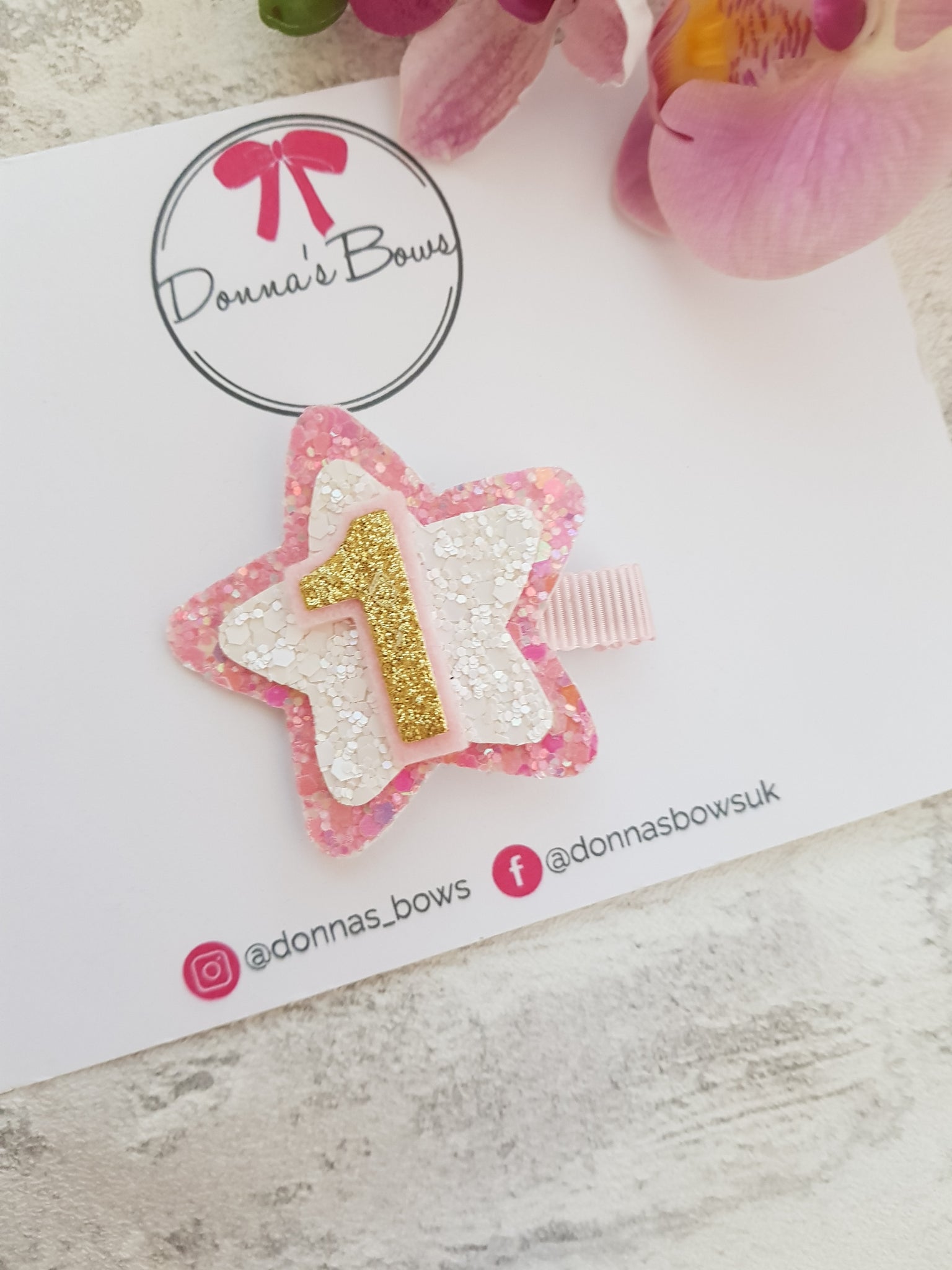 Beautiful birthday glitter fabric layered star with number. This small star is perfect for 1st birthdays and small heads.