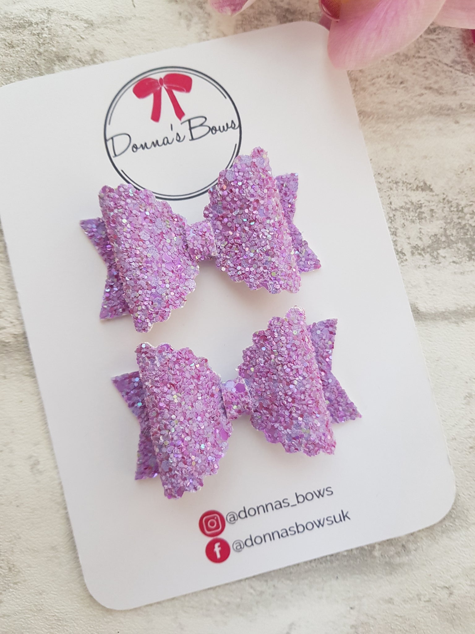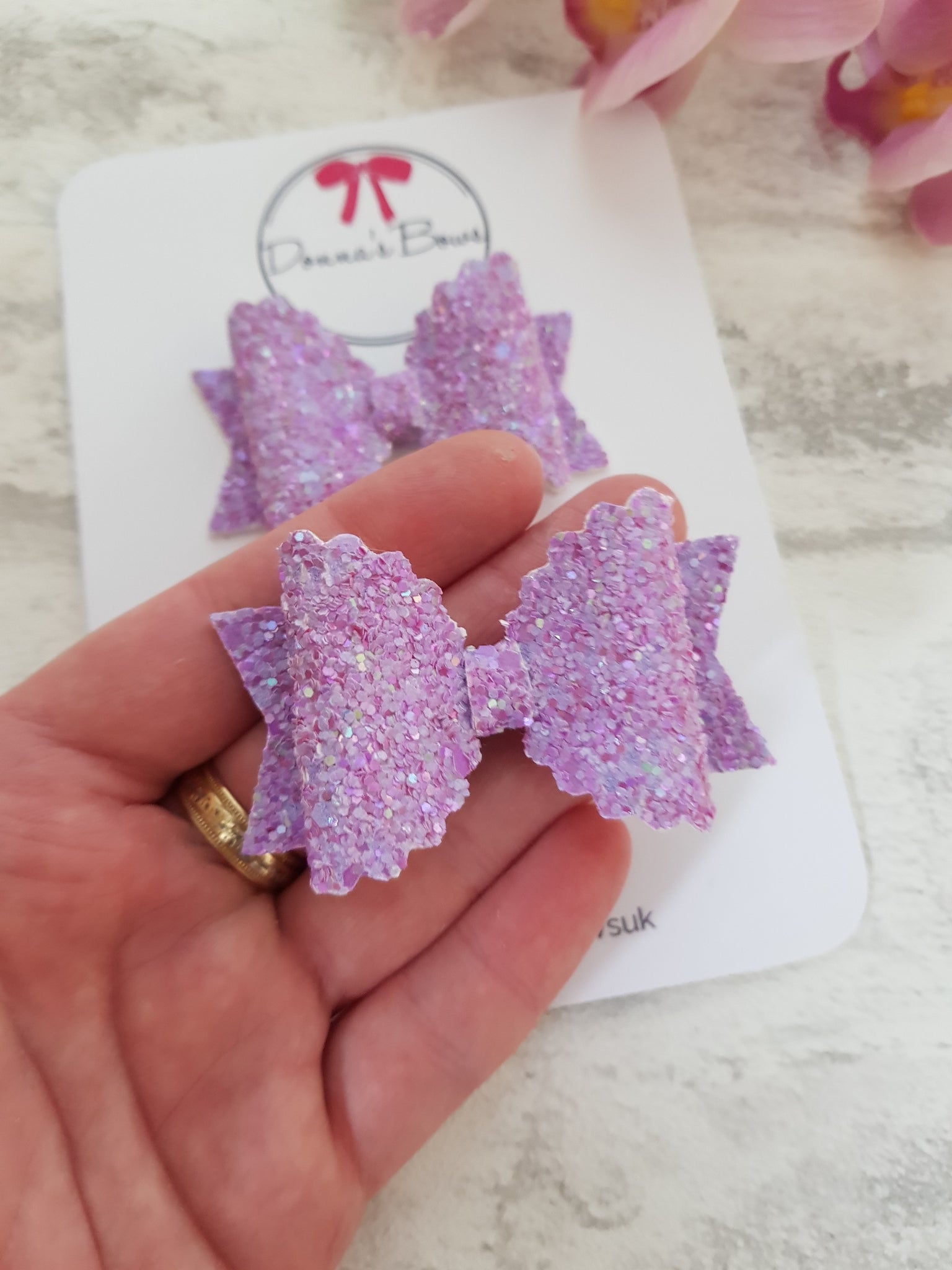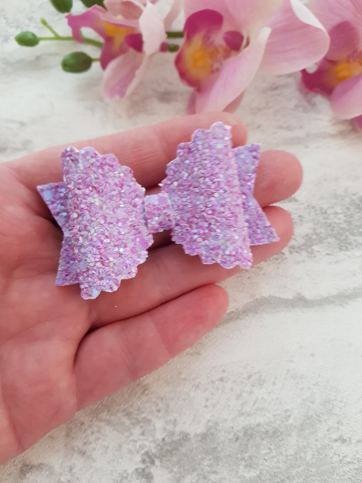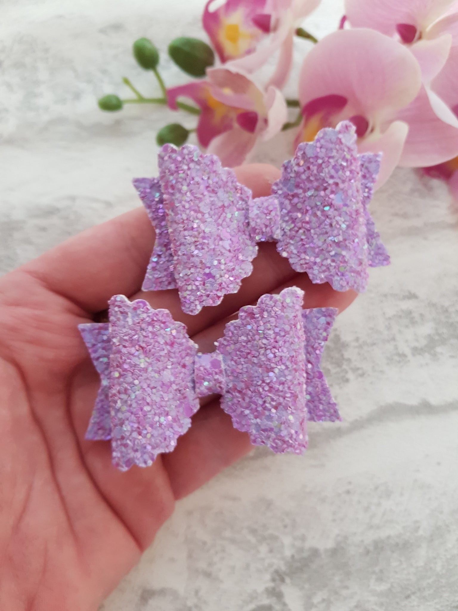 Purple and pink mixed speck pigtail bows in a rare scallop shape.