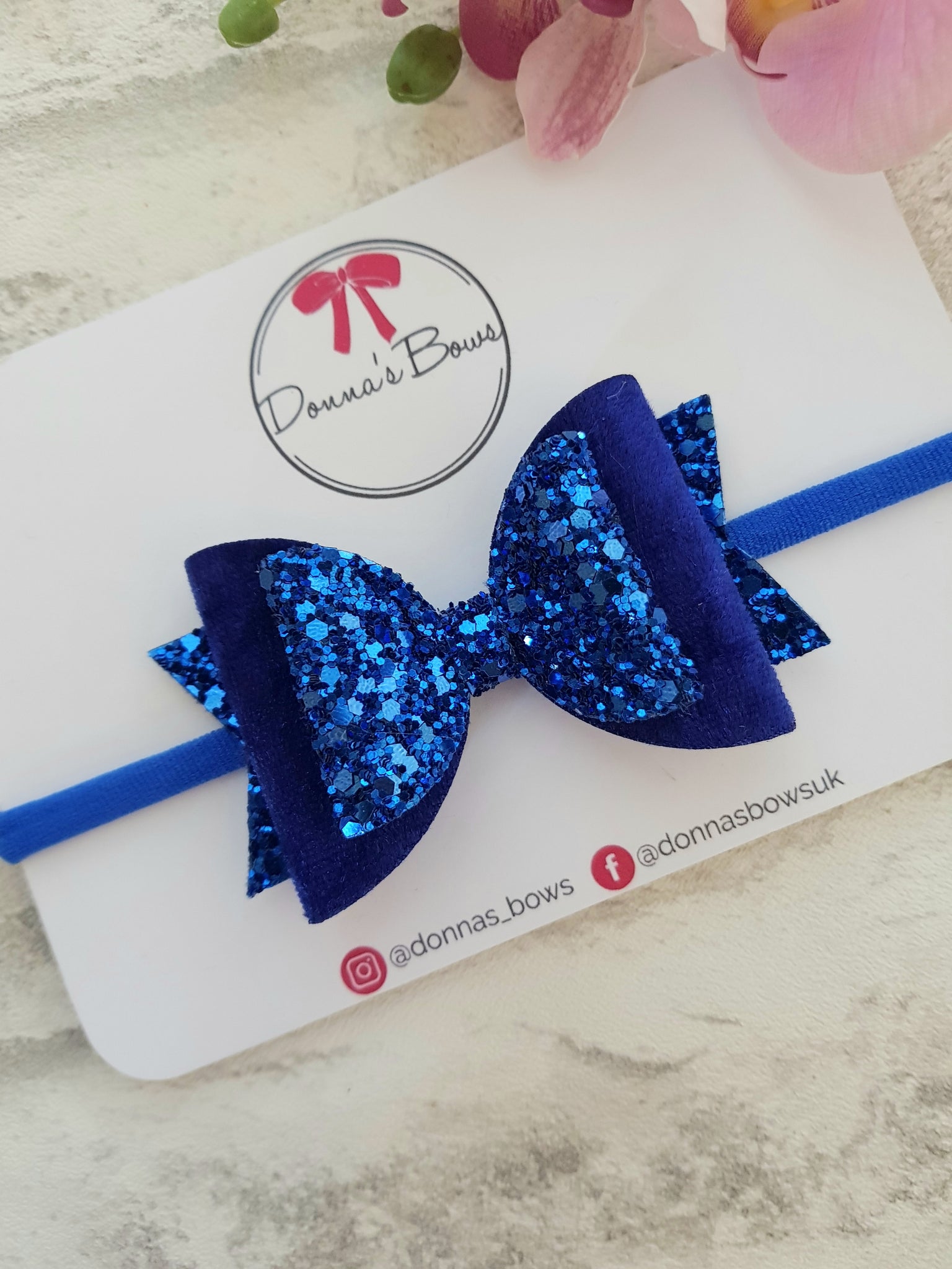 A gorgeous royal blue glitter and velvet fabric felt layered bow.